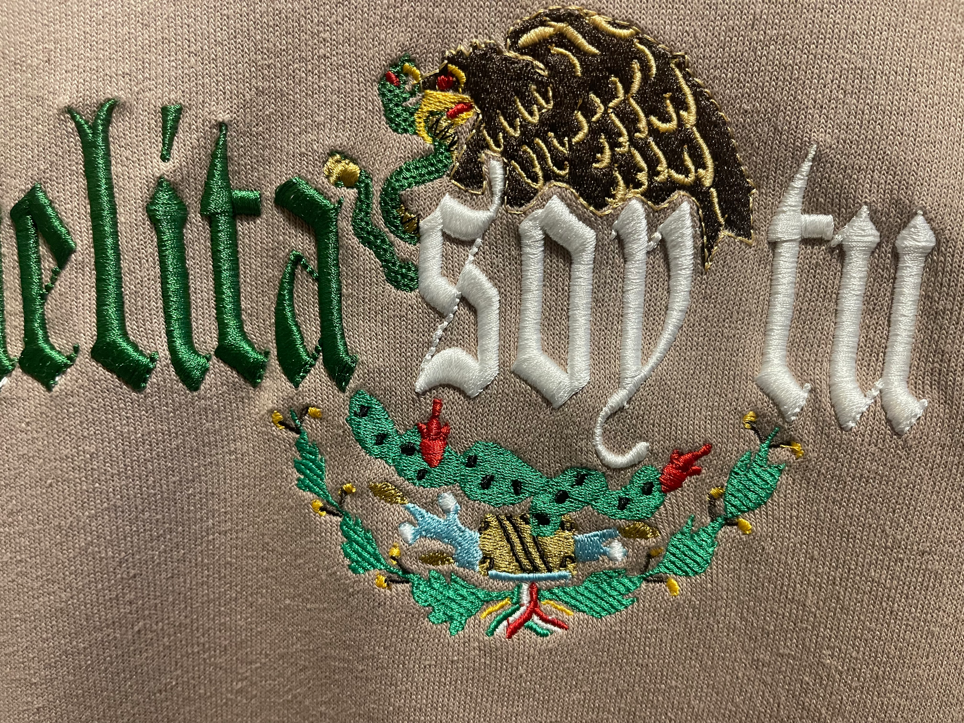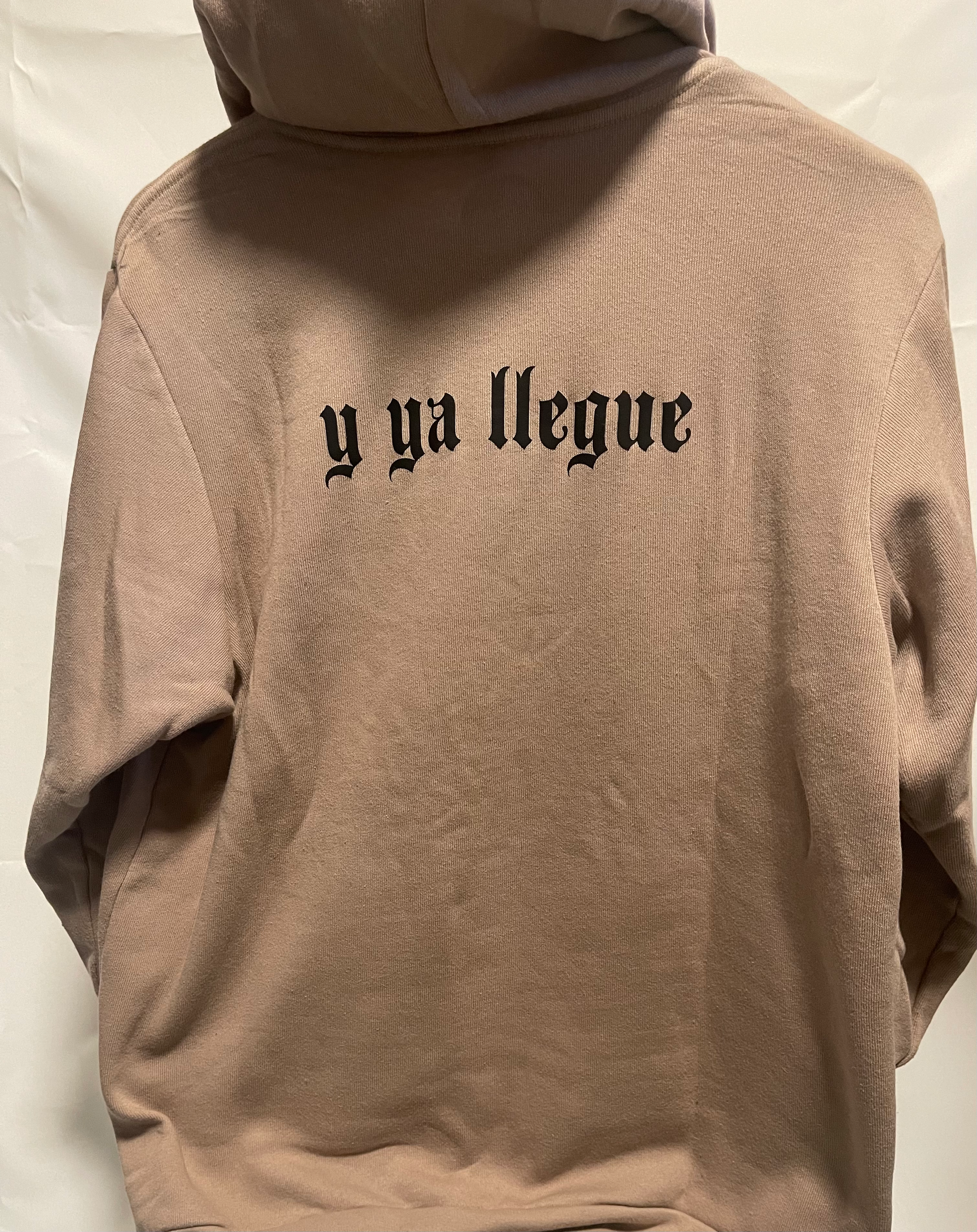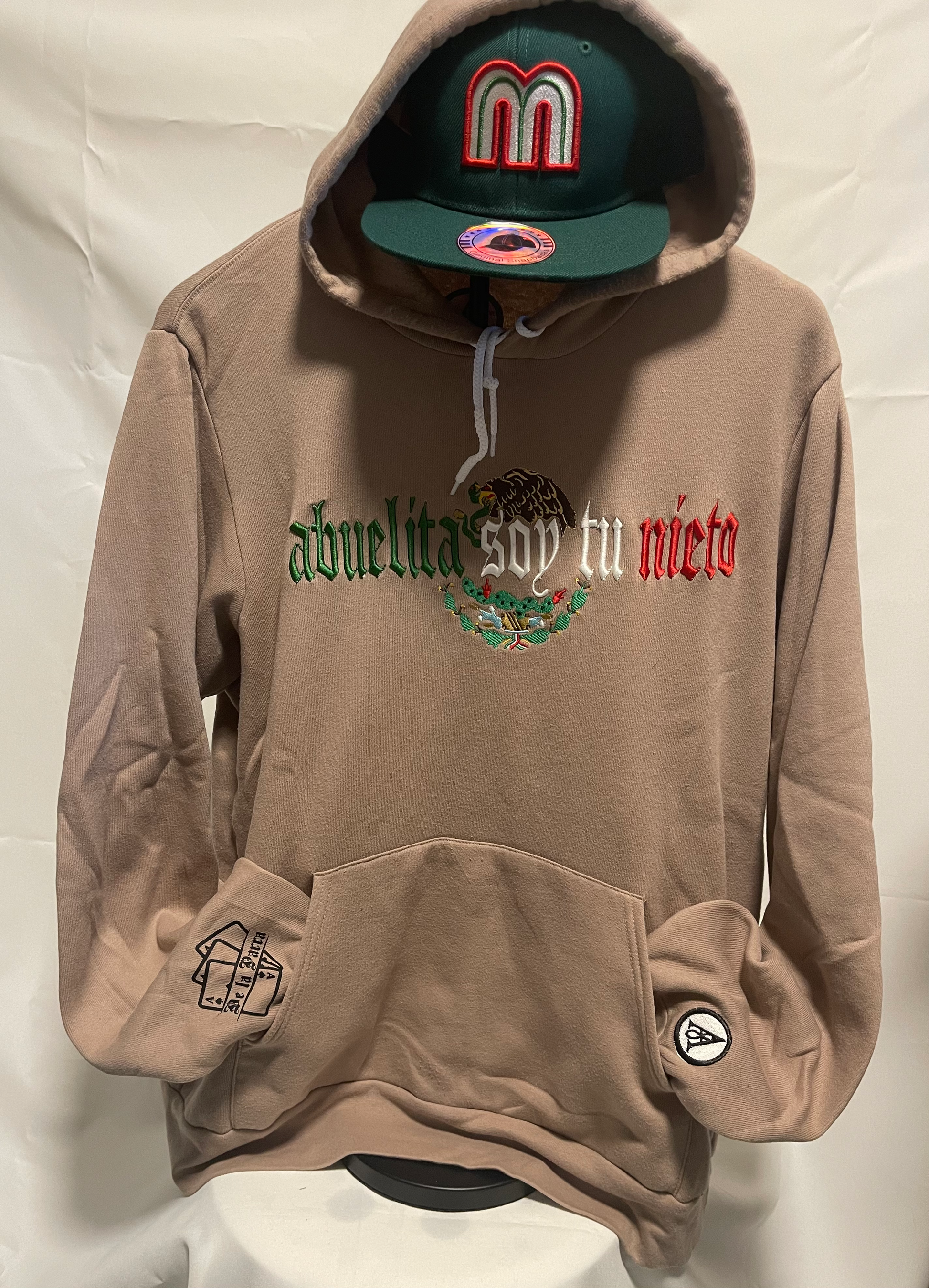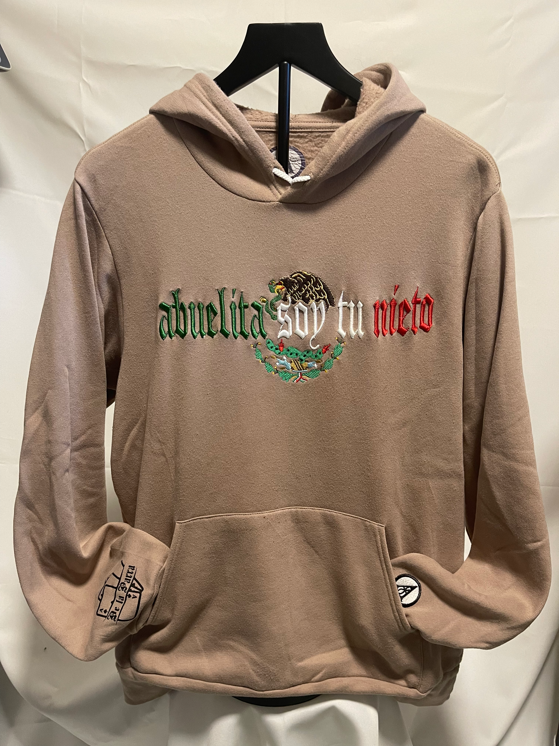 Tan Hoodie Embroidered with the Puff phrase "Abuelita Soy Tu Nieto" and the Mexican eagle escudo in the back the continuation of the phrase "y ya llegue"